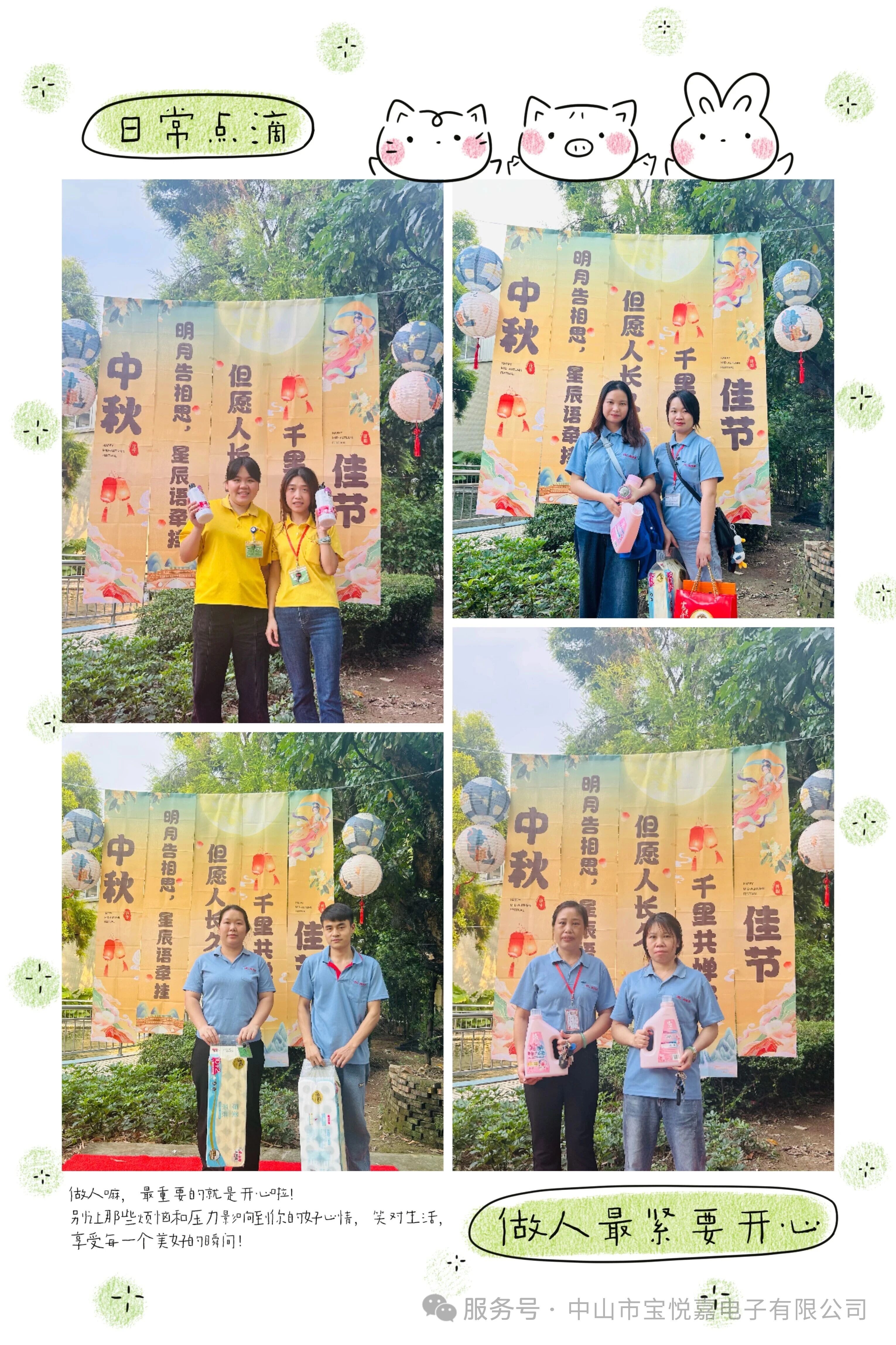 创意互动,点亮佳节。当天巧手制作的传统花灯在指尖绽放,趣味灯谜引发智慧碰撞。当传统与现代相遇,每个环节都成为这个秋天最温暖的记忆。当天中山宝悦嘉鱼塘满是中秋热闹气!非遗花灯映得路面亮堂堂,灯谜挂饰前围满同事,有人盯着谜题小声讨论,有人得到答案时眼睛亮起来。兑奖区排着小队,员工们拿着公司赠送的月饼和自己猜中灯谜兑换的奖品,脸上映照着喜庆的表情,微风里飘着笑声,连灯影都跟着热闹,满是员工开心的暖劲儿~